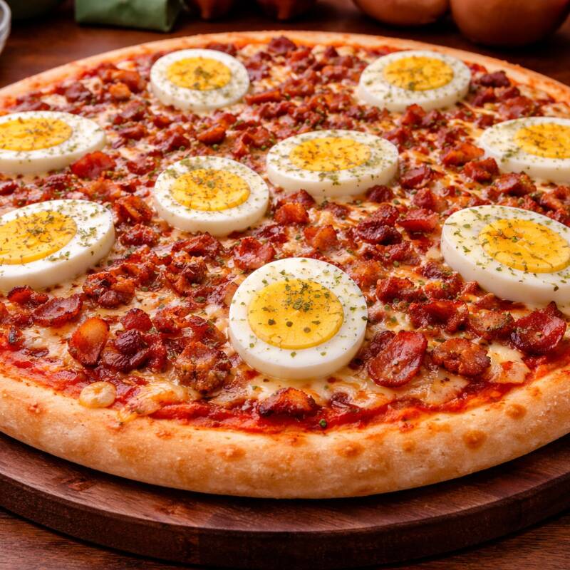Pizza Africana preparada com massa tradicional, coberta com molho de tomate especial, mussarela derretida, bacon crocante, ovos e orégano aromático, criando uma combinação rica, intensa e extremamente saborosa