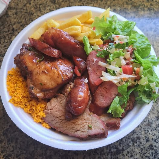 Marmita de Churrasco preparada na hora, com carne suculenta, frango douradinho e linguiça toscana bem temperada, trazendo aquele sabor defumado, intenso e irresistível. Acompanha arroz branco soltinho, feijão tropeiro caprichado e salada verde fresquinha