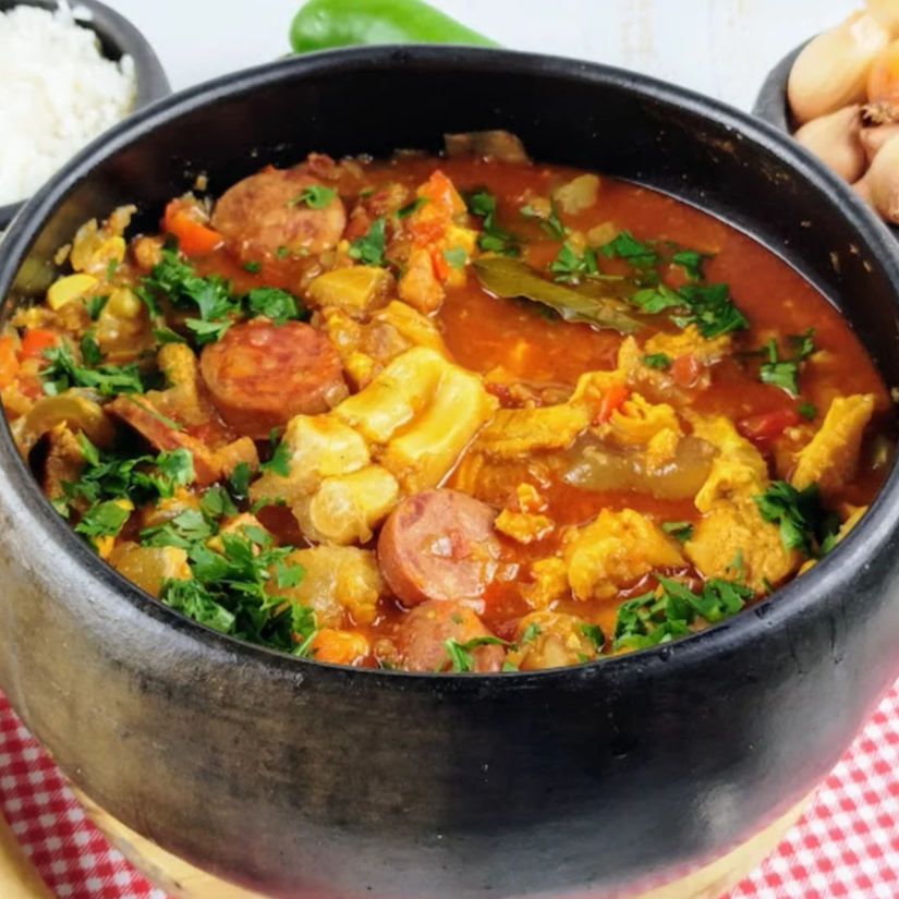 Ensopado de Frango preparado na hora, com frango macio e suculento, envolvido em um caldo encorpado e bem temperado, trazendo um sabor caseiro, reconfortante e irresistível. Acompanha arroz branco soltinho, feijão tropeiro bem temperado, macarrão saboroso e salada verde fresquinha