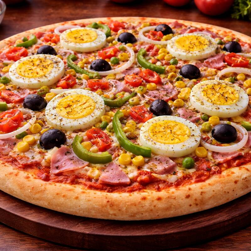 Pizza Portuguesa preparada com massa tradicional, coberta com molho de tomate especial, presunto selecionado, ovos, cebola fresca, milho verde, ervilha, azeitonas, pimentão, tomate e orégano aromático, criando uma combinação super completa, robusta, bem servida e intensamente saborosa.