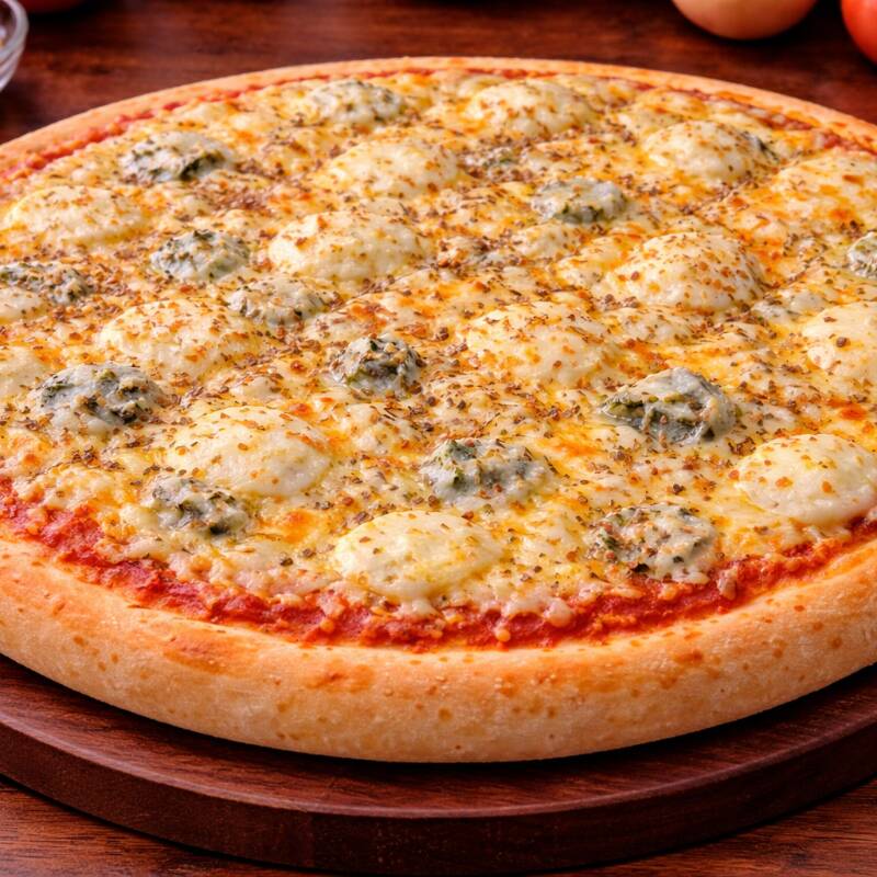 Pizza de Quatro Queijos preparada com massa tradicional, coberta com molho de tomate especial bem temperado, mussarela super derretida e puxenta, provolone levemente defumado, gorgonzola marcante e intenso e parmesão nobre e gratinado, criando uma combinação ultra cremosa, encorpada e cheia de sabor.