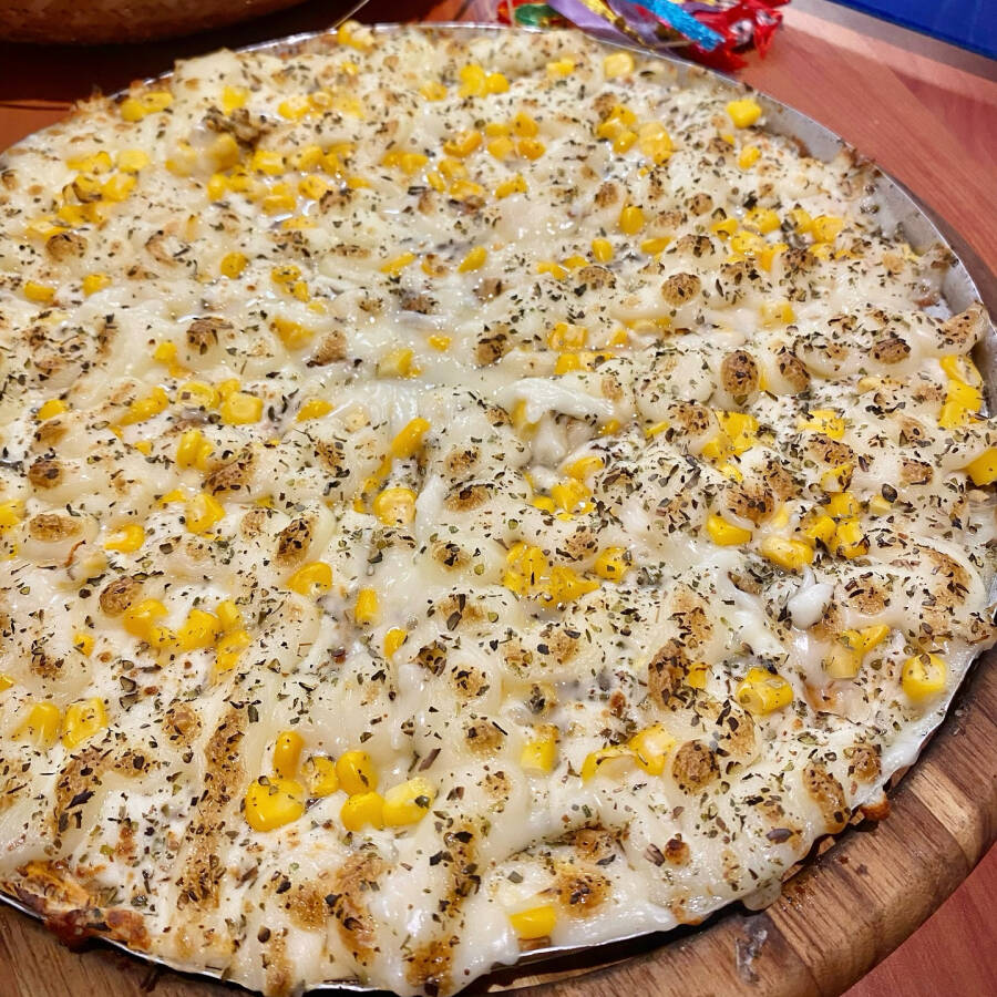 Pizza Caipira preparada com massa tradicional, coberta com molho de tomate especial, mussarela derretida, frango desfiado suculento, milho e orégano aromático, criando uma combinação leve, cremosa e cheia de sabor.