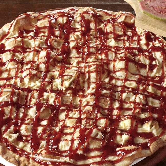 Pizza Romeu e Julieta preparada com massa tradicional, coberta com mussarela derretida, goiabada cremosa e um toque de leite condensado, criando uma combinação doce, cremosa e irresistível.