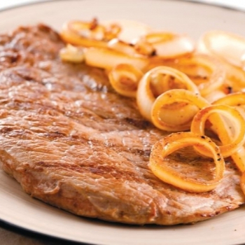 Bife Acebolado preparado na hora, com carne suculenta e macia, coberta com cebola douradinha e bem temperada, trazendo um sabor caseiro, marcante e irresistível. Acompanha arroz branco soltinho, macarrão saboroso, feijão de caldo encorpado e salada verde fresquinha