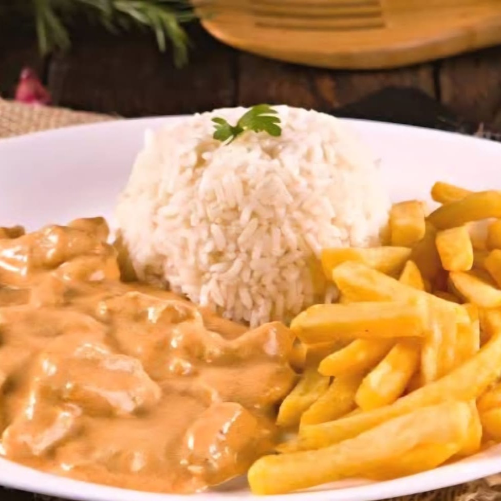 Strogonofe De Frango, Acompanhado Com Batata Cozida E Arroz