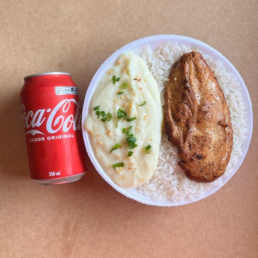 Marmita com delicioso filé de frango grelhado acompanhado de arroz branco, feijão e purê de batata inglesa. Acompanha refrigerante pet Coca Cola Zero sem açúcar bem gelado. Marmita indicada para 01 pessoa.
