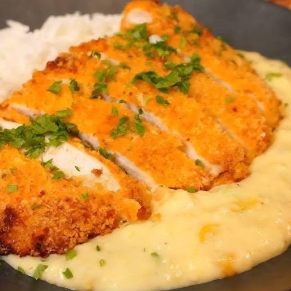 Dois suculentos filés de frango empanados e dourados, servidos com arroz soltinho e um cremoso purê de batata. Uma refeição completa, feita na medida para compartilhar com quem você ama.