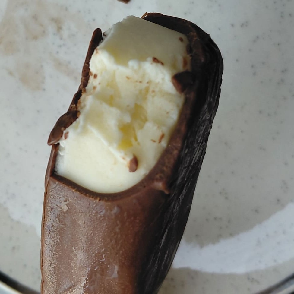 Delicia de sorvete artesanal de baunilha, feito com Nata e cobertura de chocolate nobre!