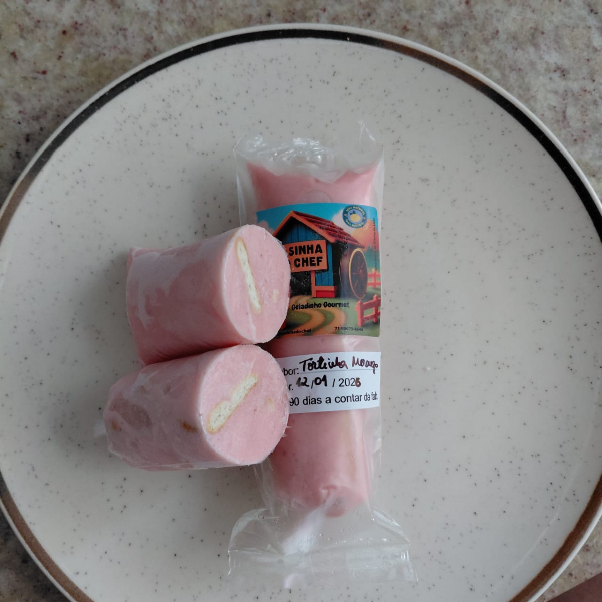 Geladinho cremoso de Morango com pedaços de biscoitos de leite, sabor que lembra muito uma tortinha de Morango congelada.