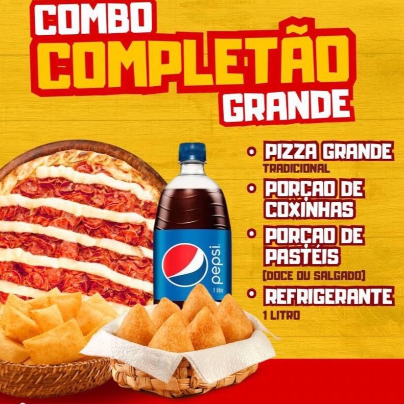 Pizza grande 8 fatias, 5 coxinhas, 5 pastéis, refrigerante 1l.