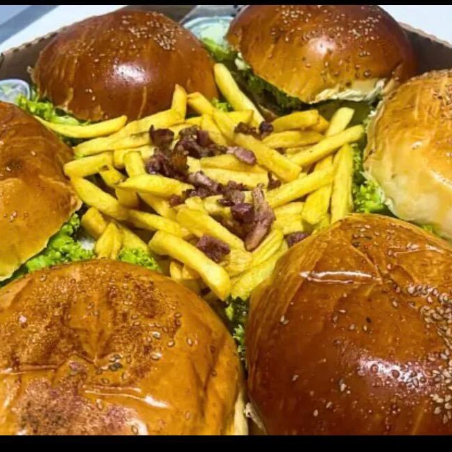 6 HAMBURGUERES ARTESANAIS + PORÇÃO DE BATATA FRITA COM BACON