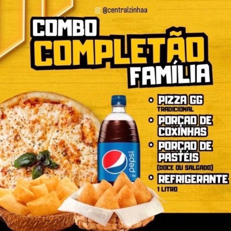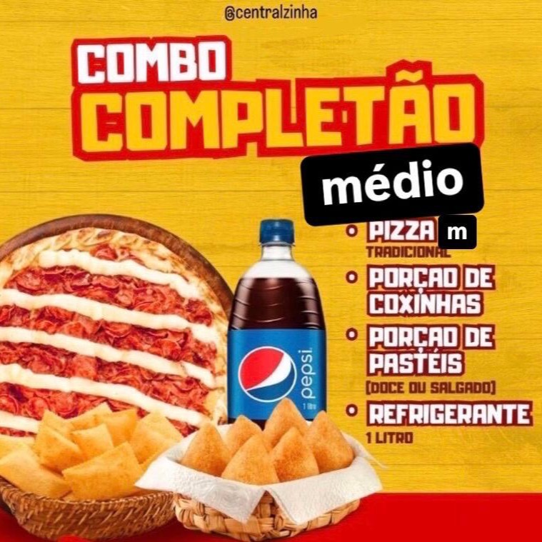 Pizza família 12 fatias, 5 coxinhas, 5 pastéis, refrigerante 1l.