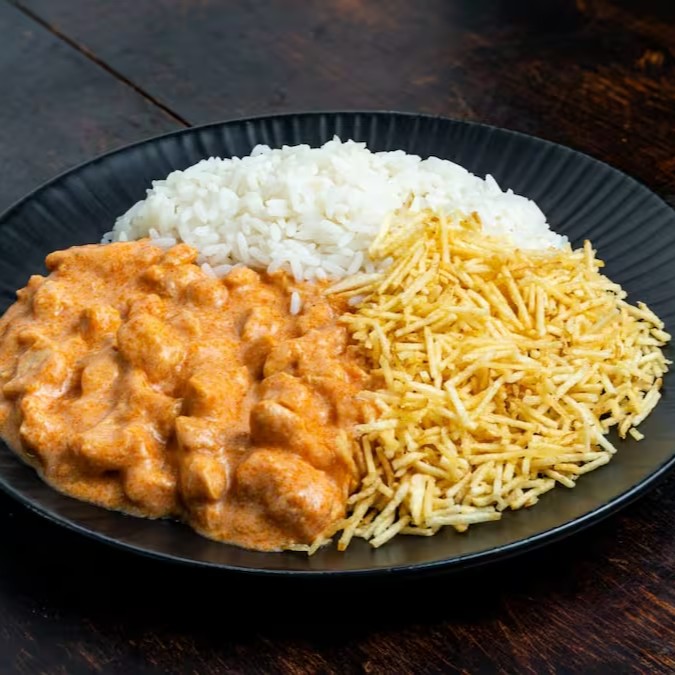 Delicioso strogonoff de frango com acompanhamentos à sua escolha. Escolha a porção que melhor te atende (1 ou 2 pessoas).