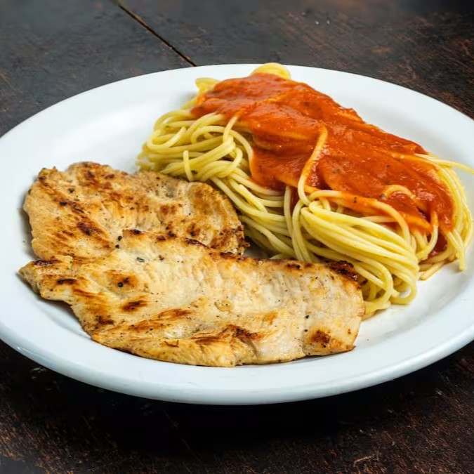 Filé de frango grelhado, suculento e temperado na medida certa. Acompanhamentos à sua escolha.