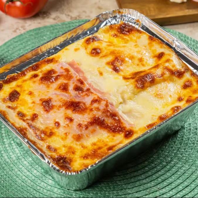 Molho de tomate artesanal, molho branco, carne moída ,queijo e presunto finalizando com parmesão