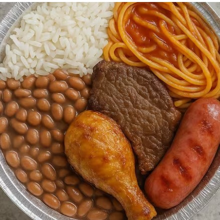 Acompanha: arroz branco, feijao tropeiro,macarrao, salada, estrogonofe de frango