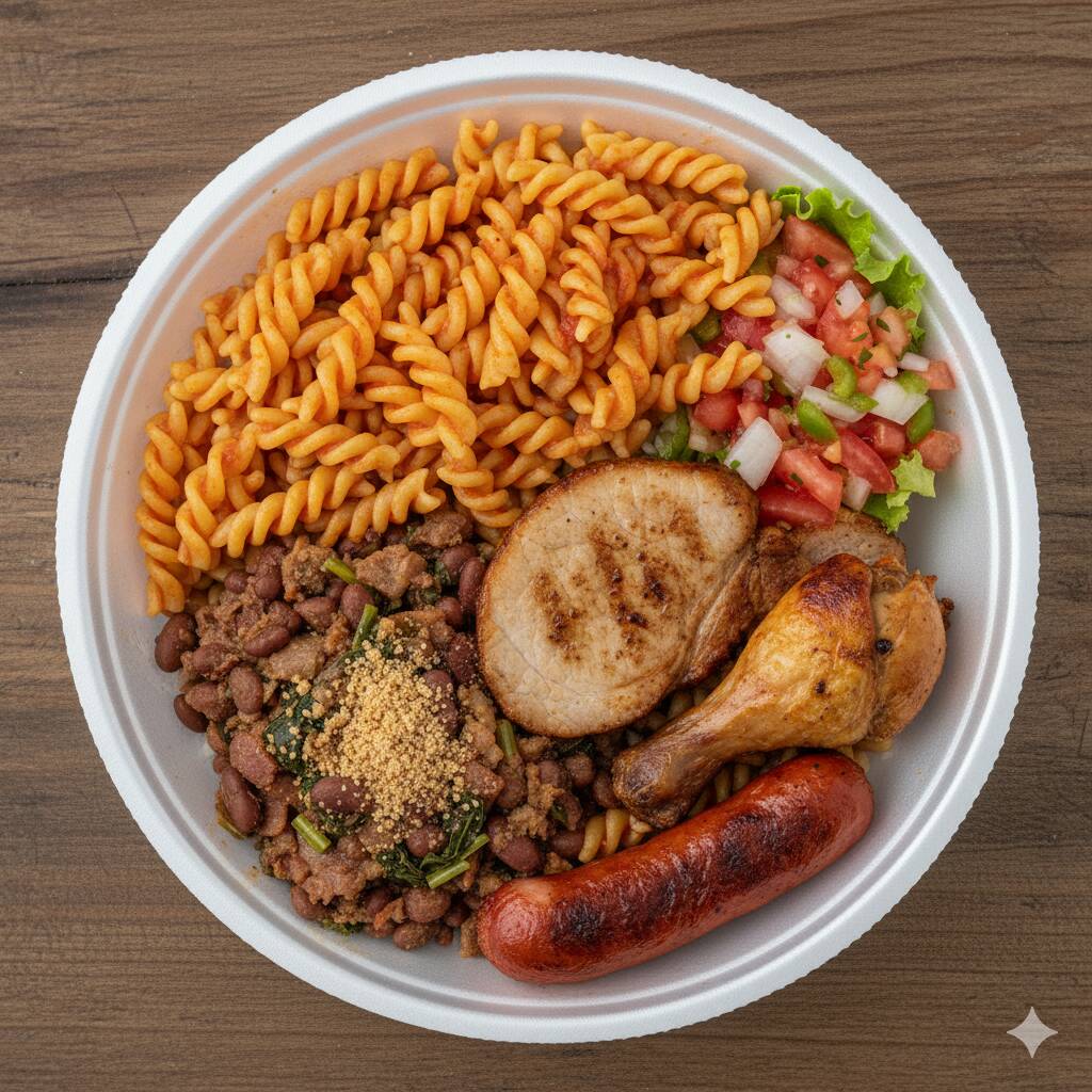 Acompanhamentos: Galinha caipira,arroz branco,feijao tropeiro,macarrao,salada vinagrete. serve ate 1-pessoa.