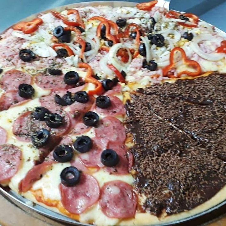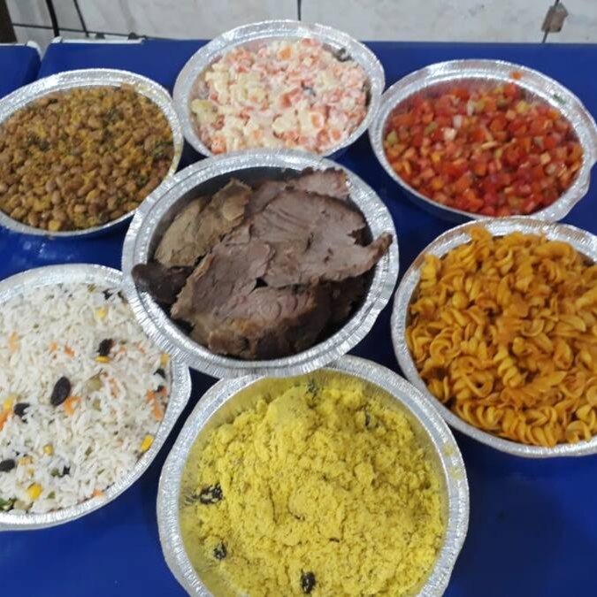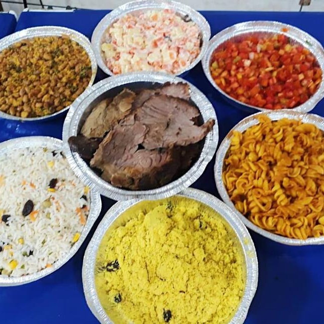 Feijão, arroz, macarrão, salada maionese e vinagrete, carne boi, pernil, frango na brasa e calabresa