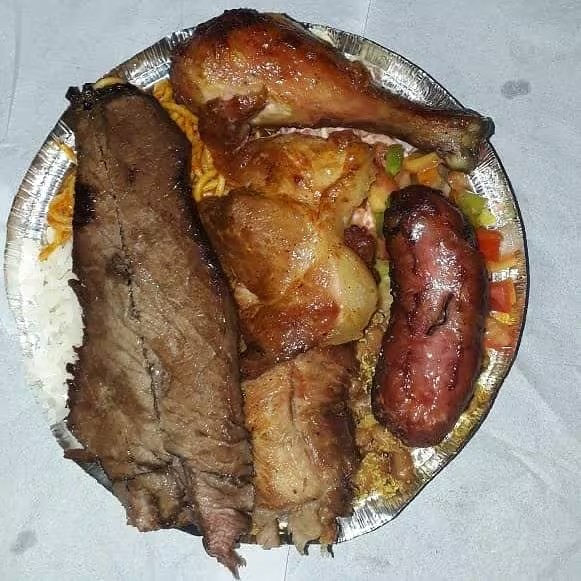 Feijão, arroz, macarrão, salada maionese e vinagrete, carne boi, pernil, frango na brasa e calabresa e farofa.