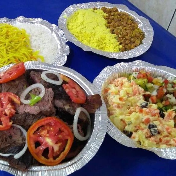 Feijão, arroz, macarrão, salada maionese e vinagrete,carne boi, pernil, frango na brasa e calabresa