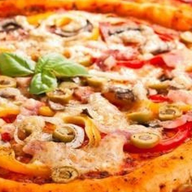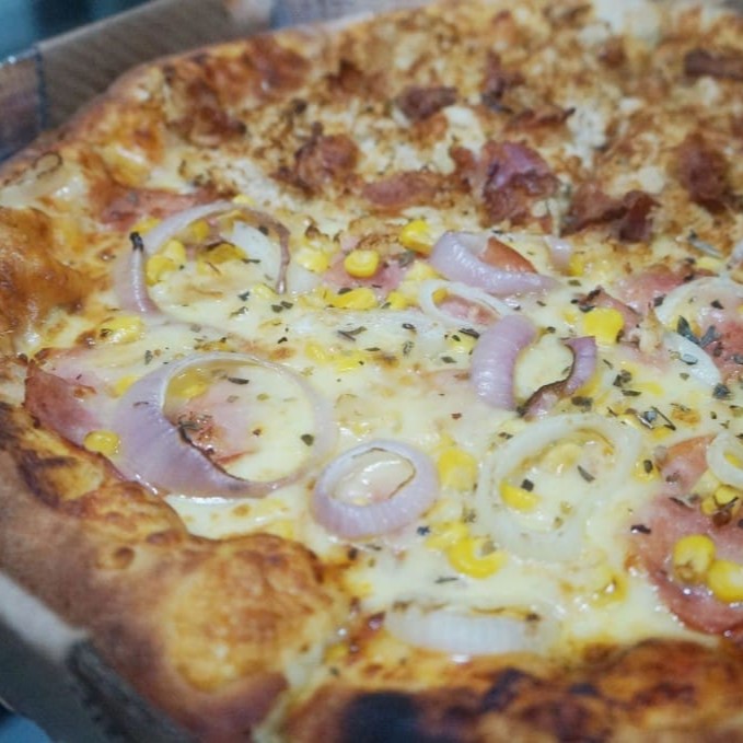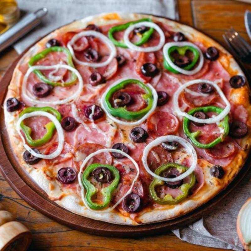 Mussarela,, presunto, tomate, cebola, azeitonas e orégano.
