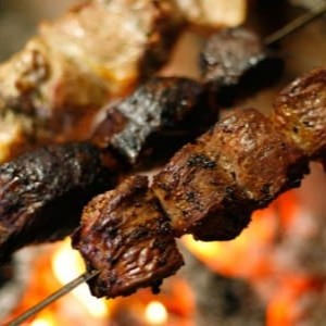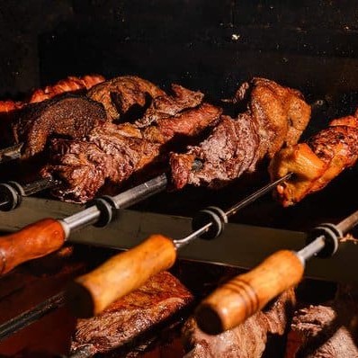 Acompanha: boi, frango, porco, calabresa, feijão tropeiro, arroz, macarrão e salada de vinagrete e maionese.