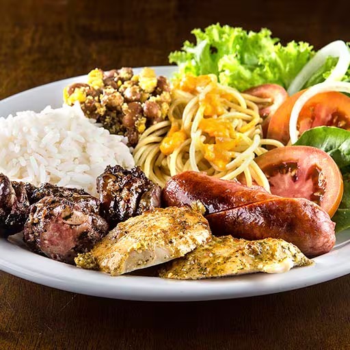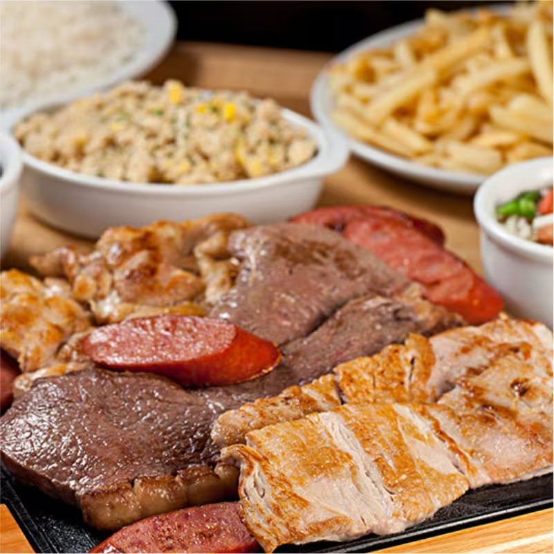Carne bovina suculenta, carne suína macia, frango desmanchando, linguiça toscana fritinha. Acompanha feijão tropeiro bem temperado, arroz branco soltinho, farofa crocante e vinagrete fresco.