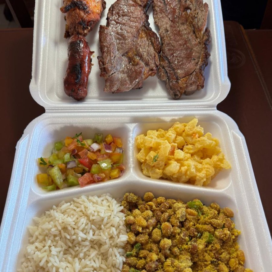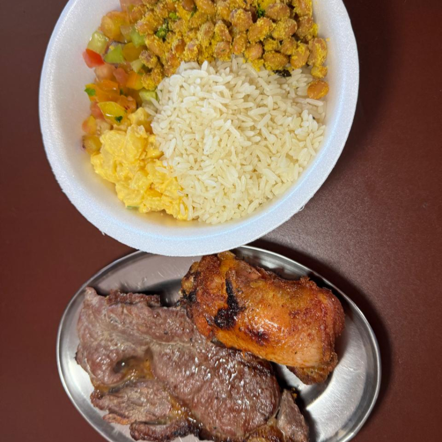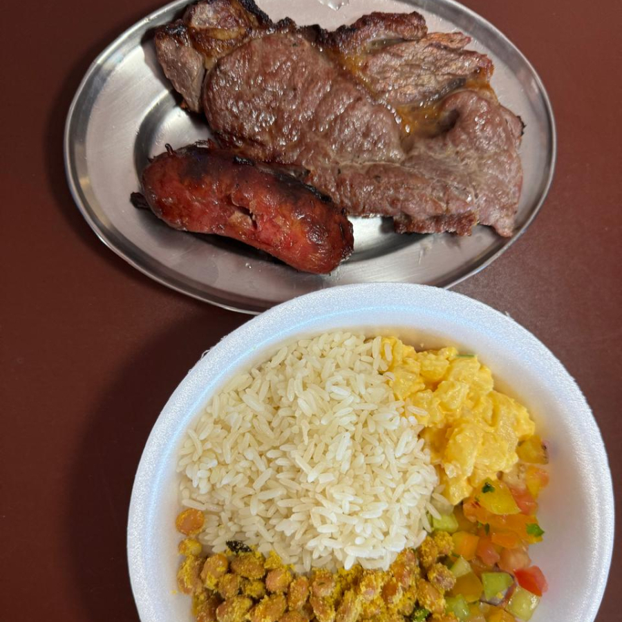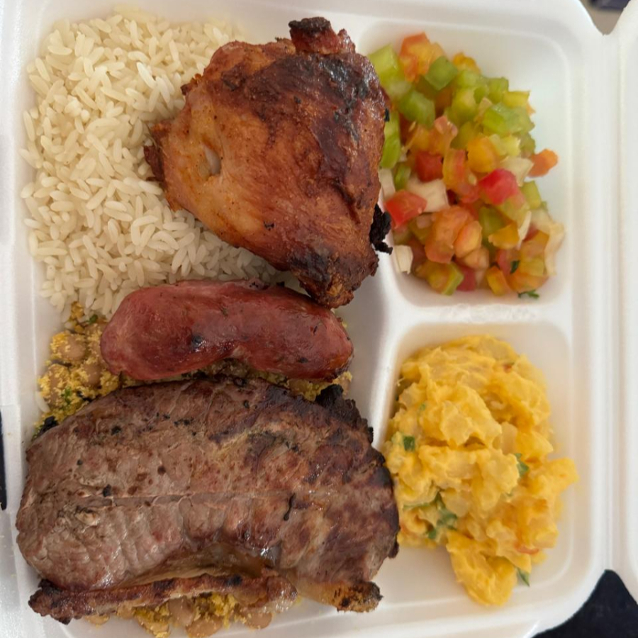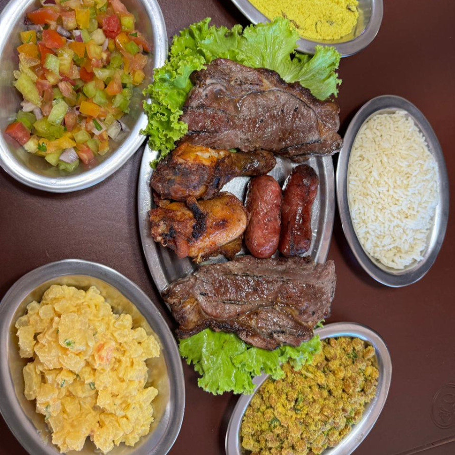 (3 filés, 3 frangos, 3 toscanas, 1 bisteca, 1 carne de sol) Feijão tropeiro , arroz branco , vinagrete , maionese e farofa