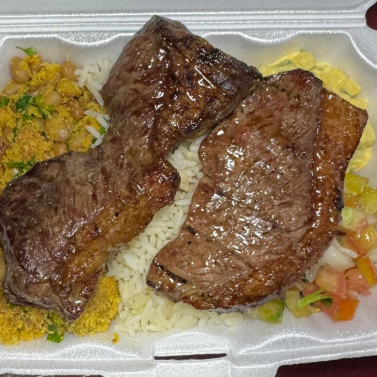 (2 filés, 2 frangos, 2 toscanas) Feijão tropeiro , arroz branco , vinagrete e maionese