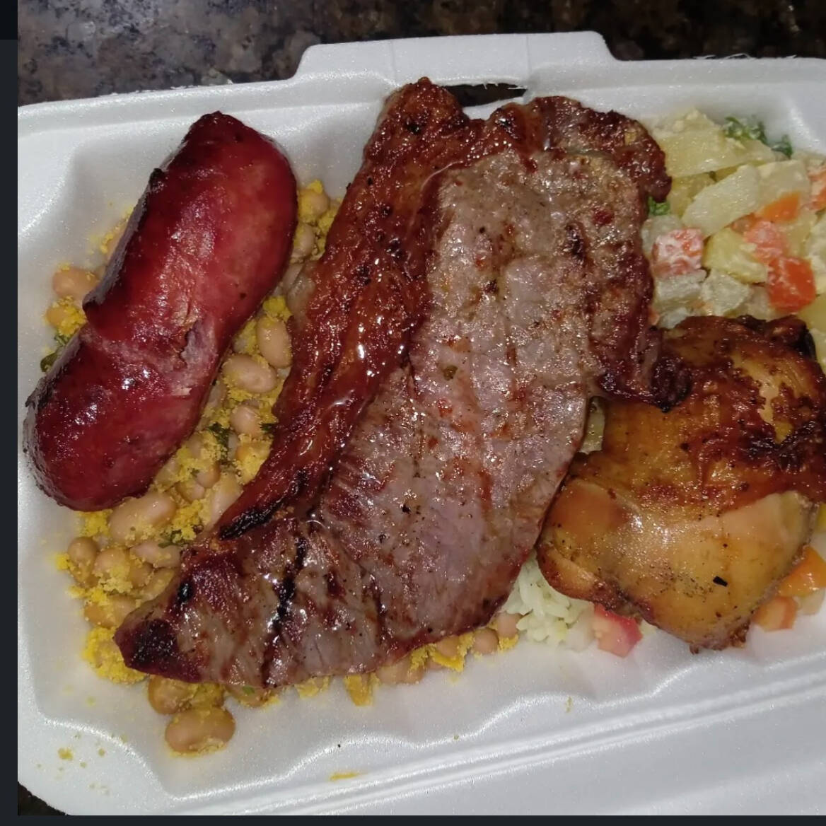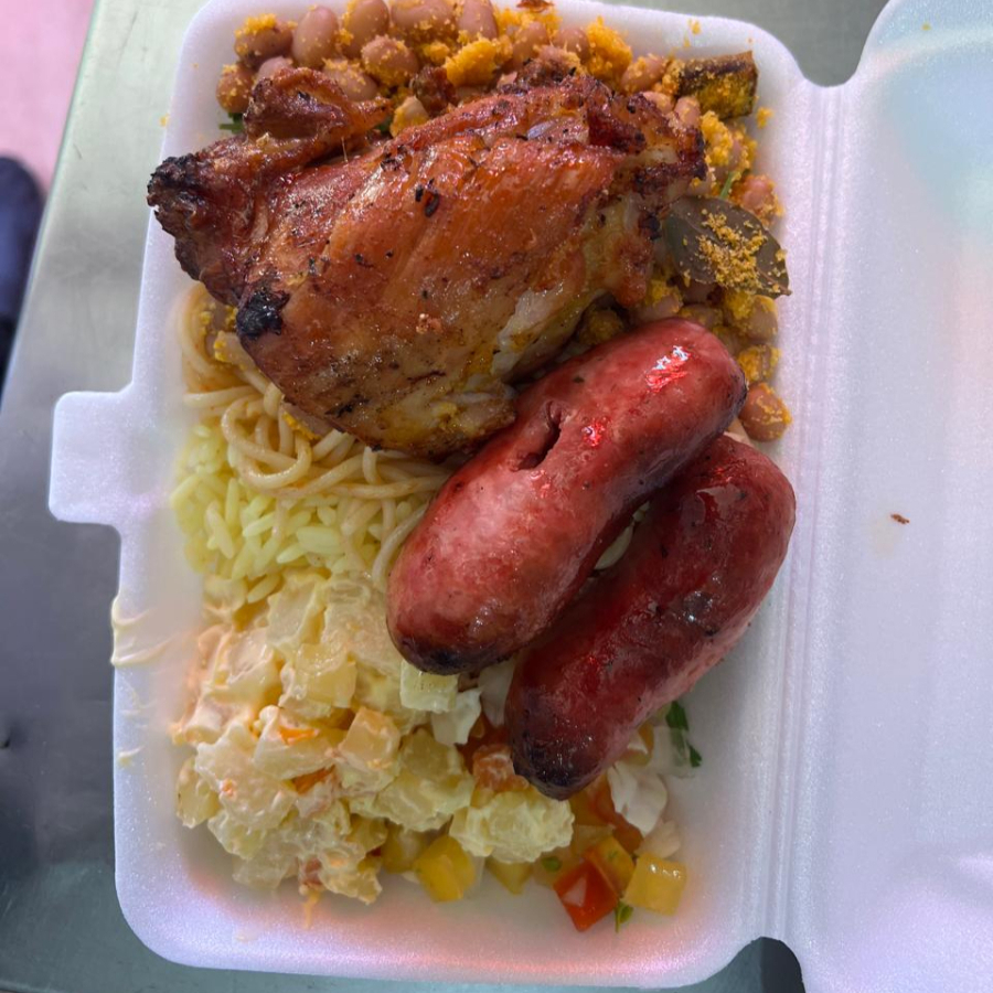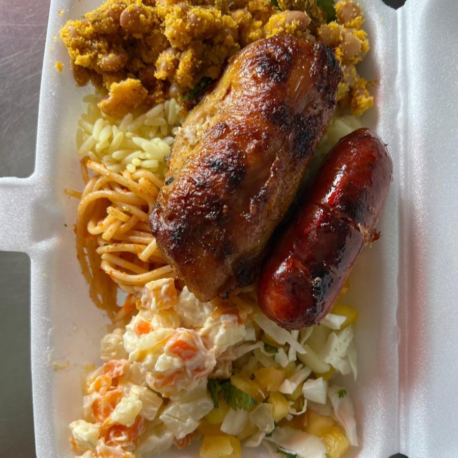 Feijão tropeiro, arroz, macarrão, salada de maionese e vinagrete.