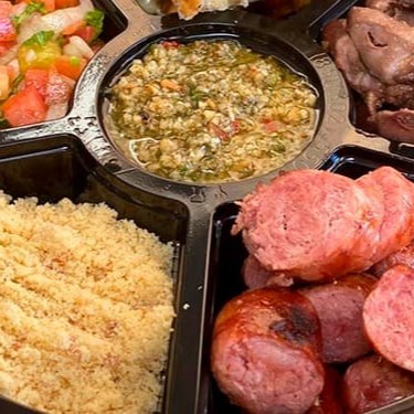 Alcatra, 4 linguiças toscana, 2 sobrecoxas, suíno ou coração de frango) aproximadamente 800g assados diretamente da churrasqueira, escolha 4 opções de acompanhamento deliciosos e bem temperados !
