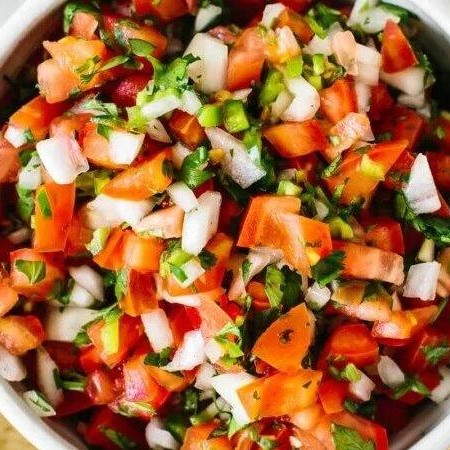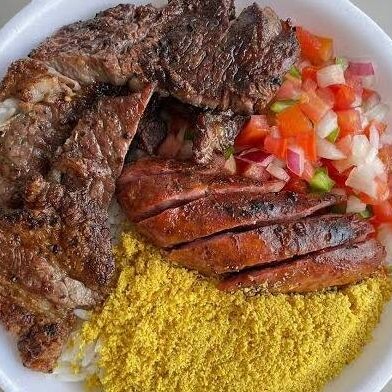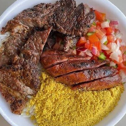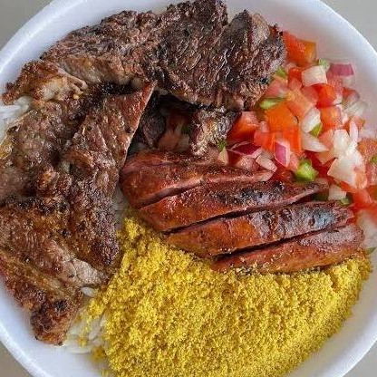 Feijão tropeiro, arroz, salada vinagrete e farofa.