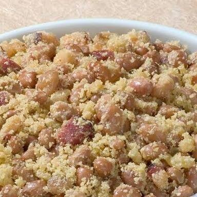 Feijão tropeiro, arroz, salada vinagrete, e farofa.