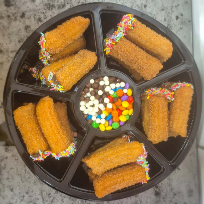 15 mini churros recheados com granulado por cima + recheio extra com disket e chocobool por cima.