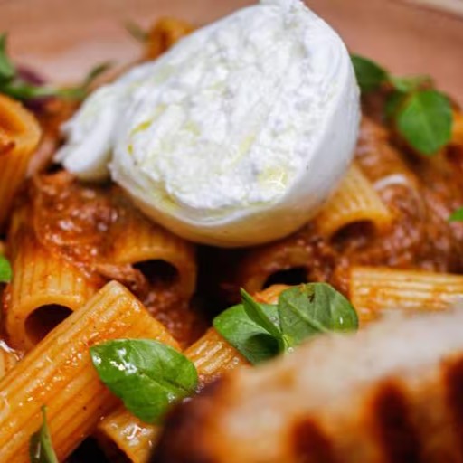 Rigatoni com ragu de costela suína ao vinho, azeitonas Azapa e burrata. Acompanha fatia de pão sourdough.