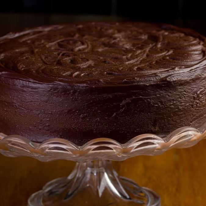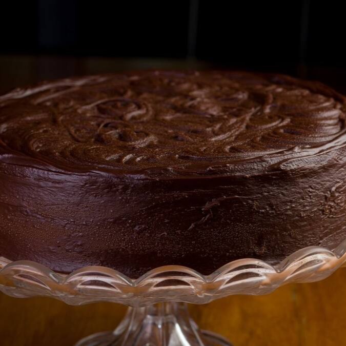 Bolo à base de biscoito, recheio de creme alemão e cobertura de ganache da casa.