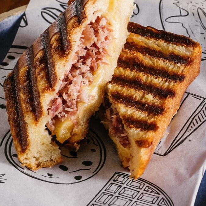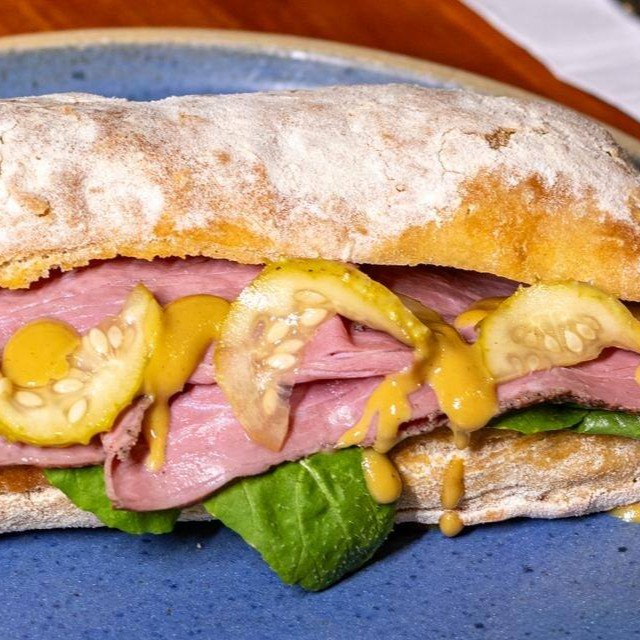 Pão ciabata, pastrami artesanal, picles de maxixe e de cebola, rúcula, molho de mostarda Dijon.