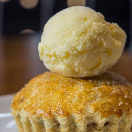 Rolinho de pão com açúcar mascavo e canela. Aquecido e servido com fondant no topo.