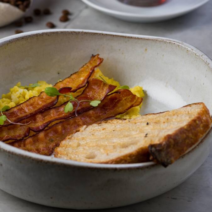 Ovos cremosos preparados com creme de leite, acompanhados de bacon crocante e fatia de pão sourdough. Um clássico do brunch, simples e delicioso.