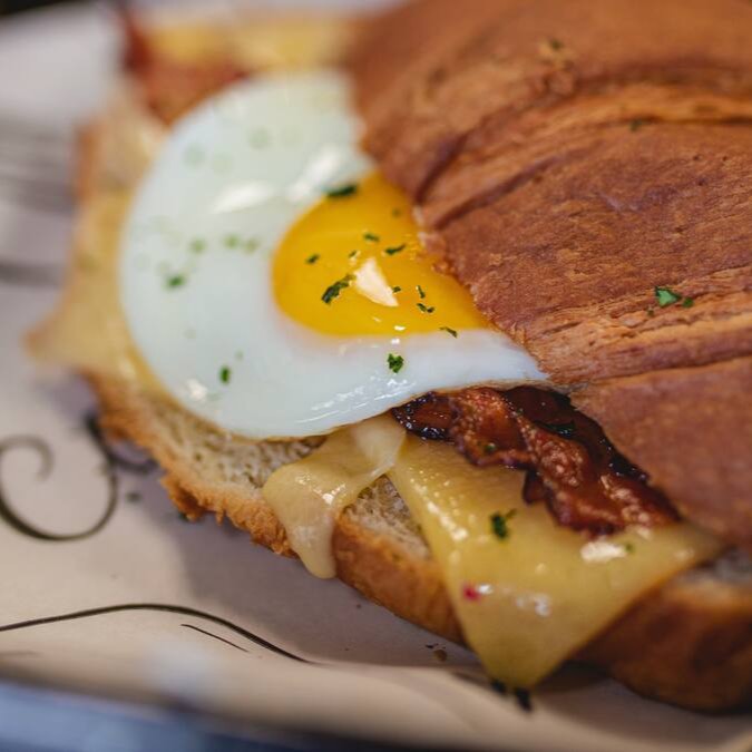Croissant amanteigado, fatias de queijo gouda, ovo perfeito (gema mole) e bacon crocante. Mais americano impossível!