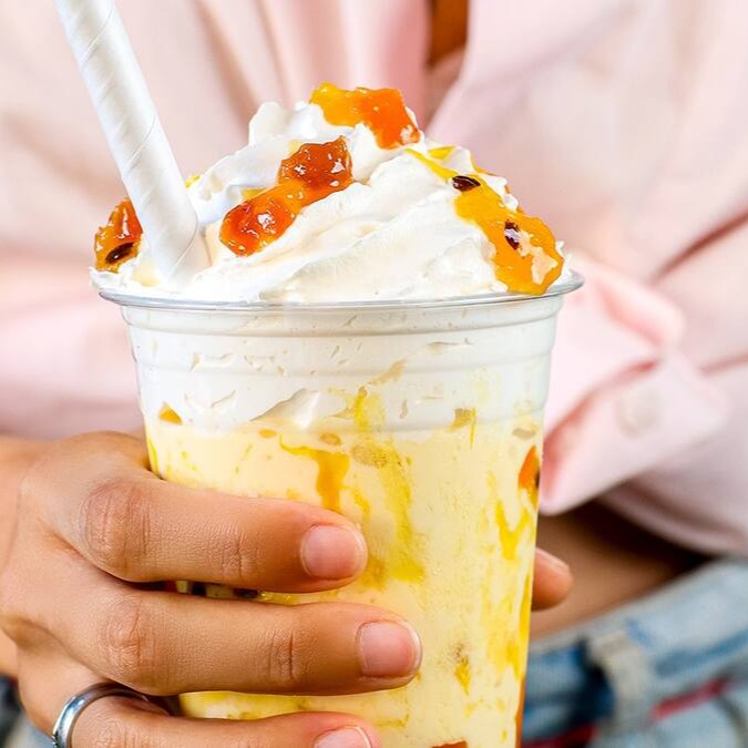 Leite batido com sorvete de creme e geléia de frutas amarelas, finalizado com chantilly.