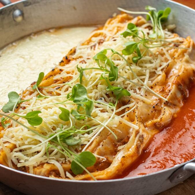 Massa italiana recheada com molho a bolonhesa com carne moída, molho de tomate caseiro, mussarela, molho bechamel e parmesão capa preta gratinado