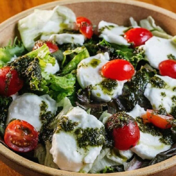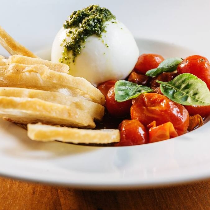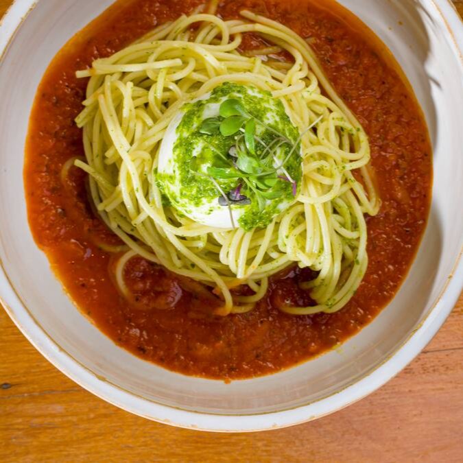 Spaghetti italiano, molho de tomate caseiro, pesto de manjericão e burrata (75g).