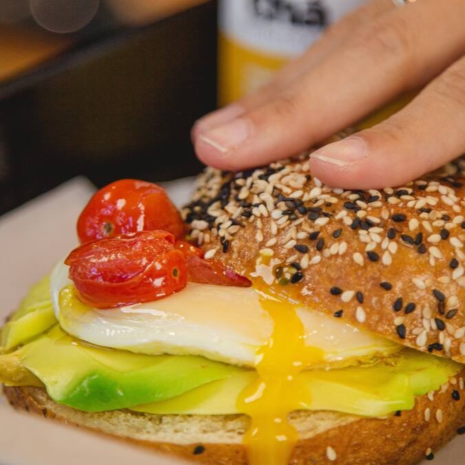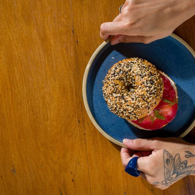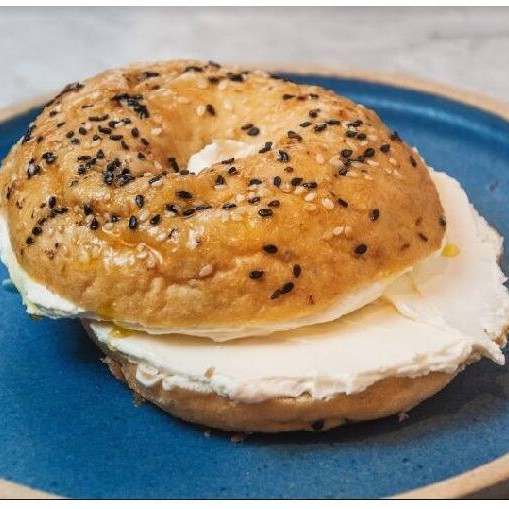 Bagel de fermentação natural, de origem judaica e fabricação própria. Servido com generosa porção de cream cheese.