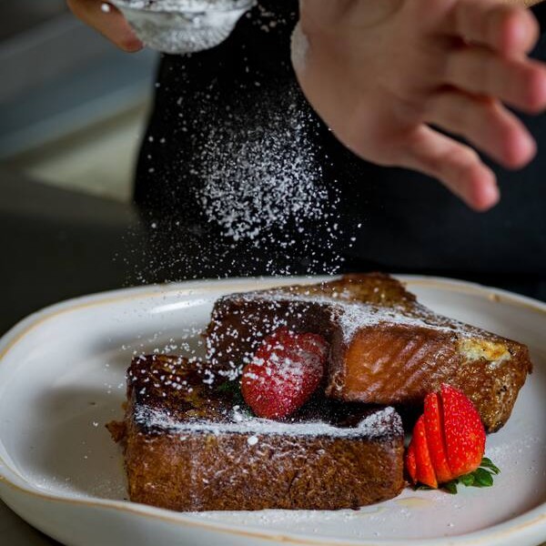 Duas torradas de pão brioche seladas, acompanhadas de morango, mel e acúcar gelado.