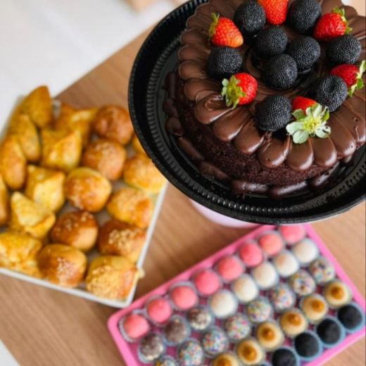bolo de 15 cm modelo baixo pesando 800 gramas, 20 salgados sortidos ,10 doces sortidos