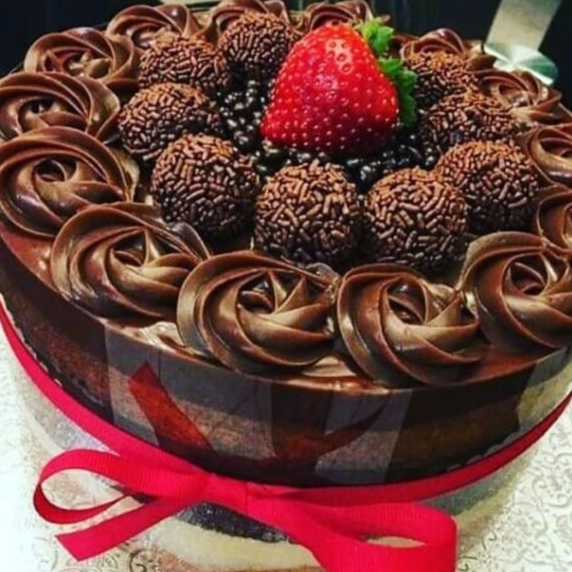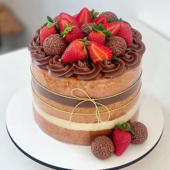 massa de chocolate com recheio de brigadeiro gourmet e pedaços de morango bolo pesando um kilo e meio