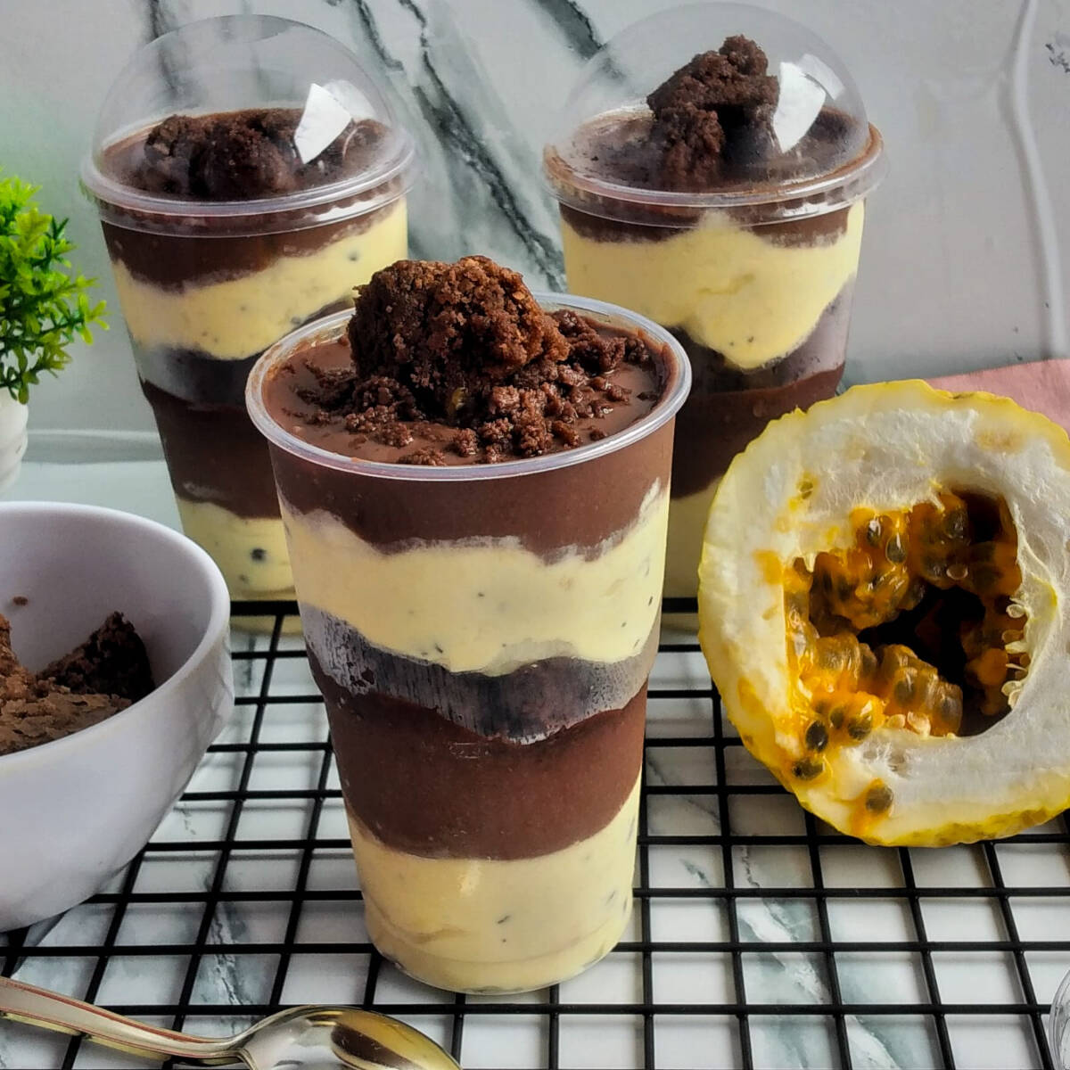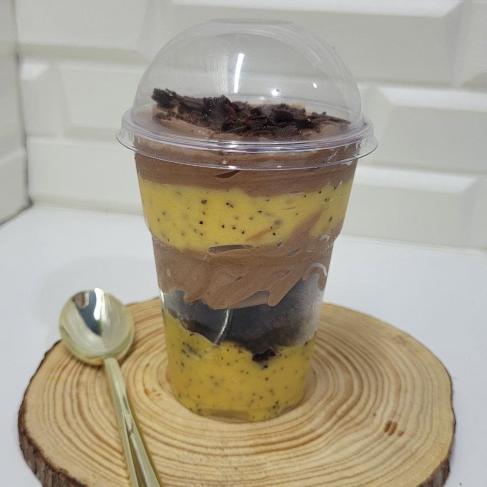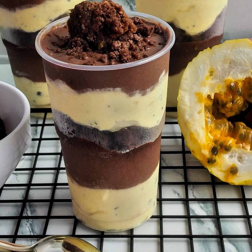 Uma deliciosa combinação: Mousse Cremoso De Maracujá, Camada De Brownie de Chocolate, Brigadeiro Trufado Cremoso de Chocolate e Raspas De Chocolate Para Finalizar! (Foto Ilustrativa)