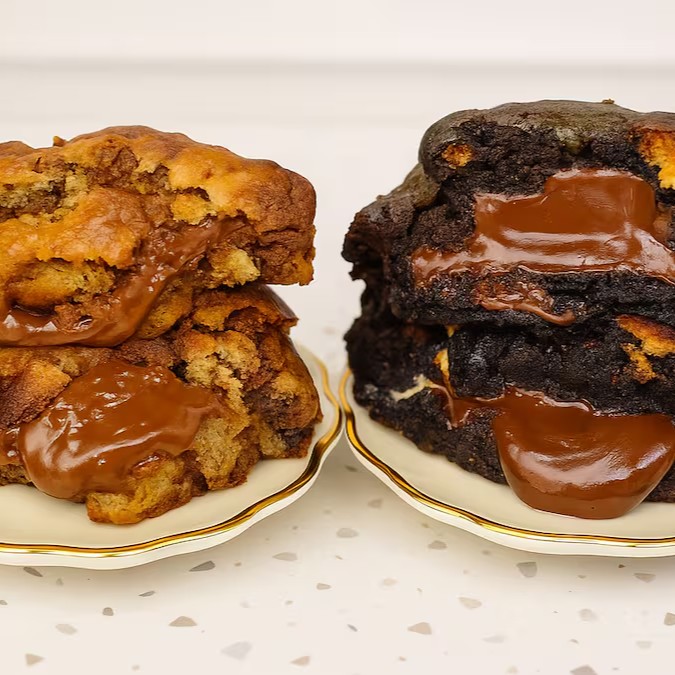 Nesta oferta você vai levar dois cookies recheados mais vendidos. 1- Cookie recheado com Nutella, 1 - Cookie duo dark Chocolatudo recheado com brigadeiro de chocolate, esses são os sabores da dupla de oferta.