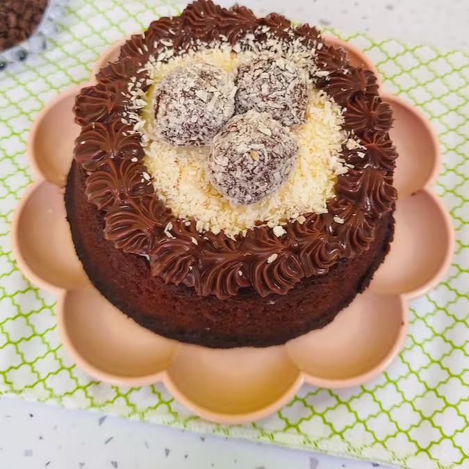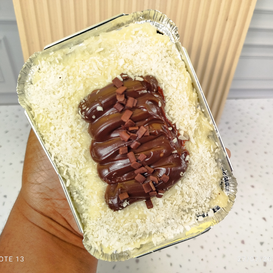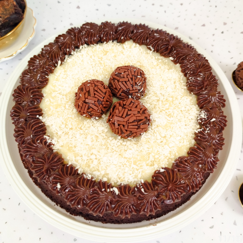 Nosso 'Bolo Piscina Prestígio' é um autêntico deleite aos amantes do chocolate. A suavidade da massa de chocolate, incrivelmente macia e fofa, eleva esse bolo a um patamar de sabor surpreendente. O recheio é uma fusão perfeita de coco e chocolate, proporcionando uma textura rica e indulgente. Como toque final, é meticulosamente adornado com dois corações de brownie, dois brigadeiros de chocolate e uma generosa camada de coco ralado. Esta sinfonia de sabores de chocolate promete uma experiência culinária inigualável, tornando cada fatia irresistivelmente tentadora.